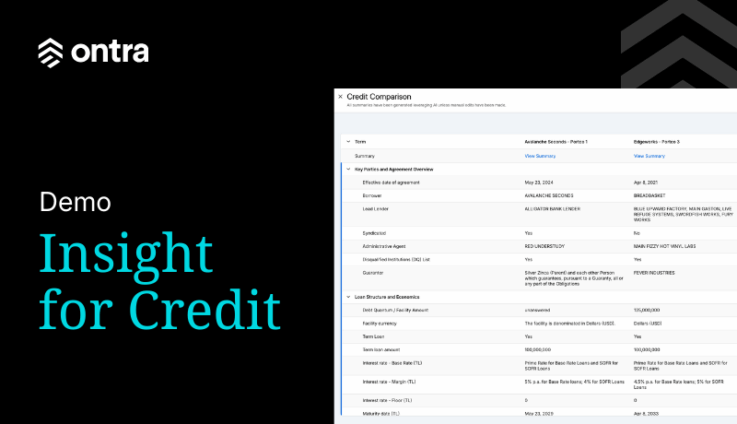 For Insight for Credit, Implementation associates follow the same process to abstract key covenants. The team also identifies a set of key business and legal terms to create summaries for each agreement. These credit agreement summaries can then be pulled into a comparison tool, allowing our users to see similarities and differences in key terms across multiple agreements.
