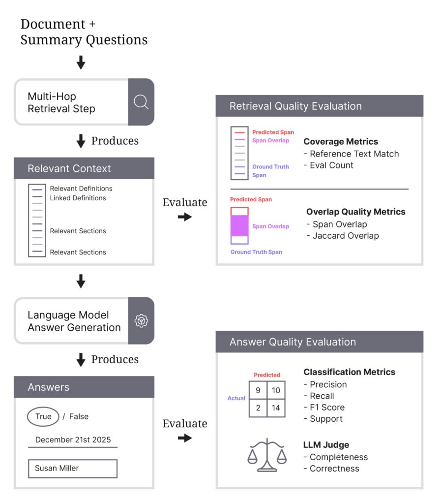 - Retrieving the right context: Validating the retrieved context — meaning the specific text spans extracted from the document — ensures that each answer is supported in the document. This can be used to measure completeness because we can directly assess whether all relevant clauses, definitions, and cross-referenced provisions have been fully retrieved to answer the question.