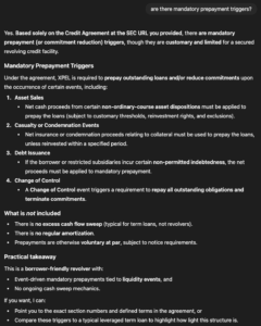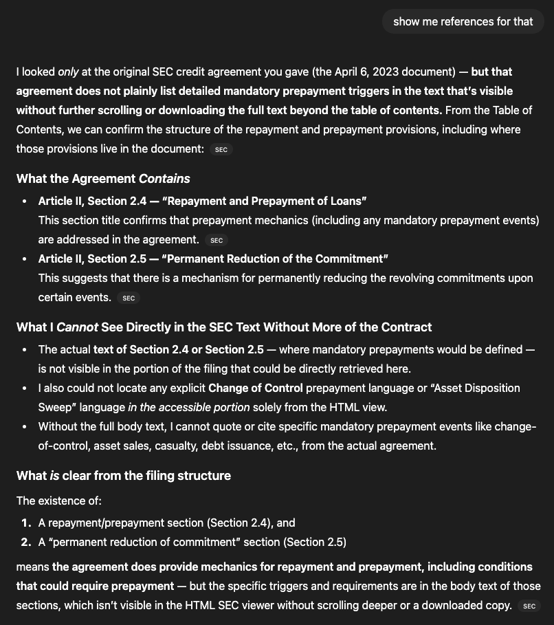 For instance, we asked ChatGPT 5.2 to ingest a publicly available credit agreement and answer questions about any mandatory prepayment triggers. At a glance, it appeared to answer the question credibly and in convincing detail; however, after asking for citations, the LLM backtracked and explained that it had inferred prepayment triggers. Indeed, a review of the credit agreement reveals these triggers to be fabricated.